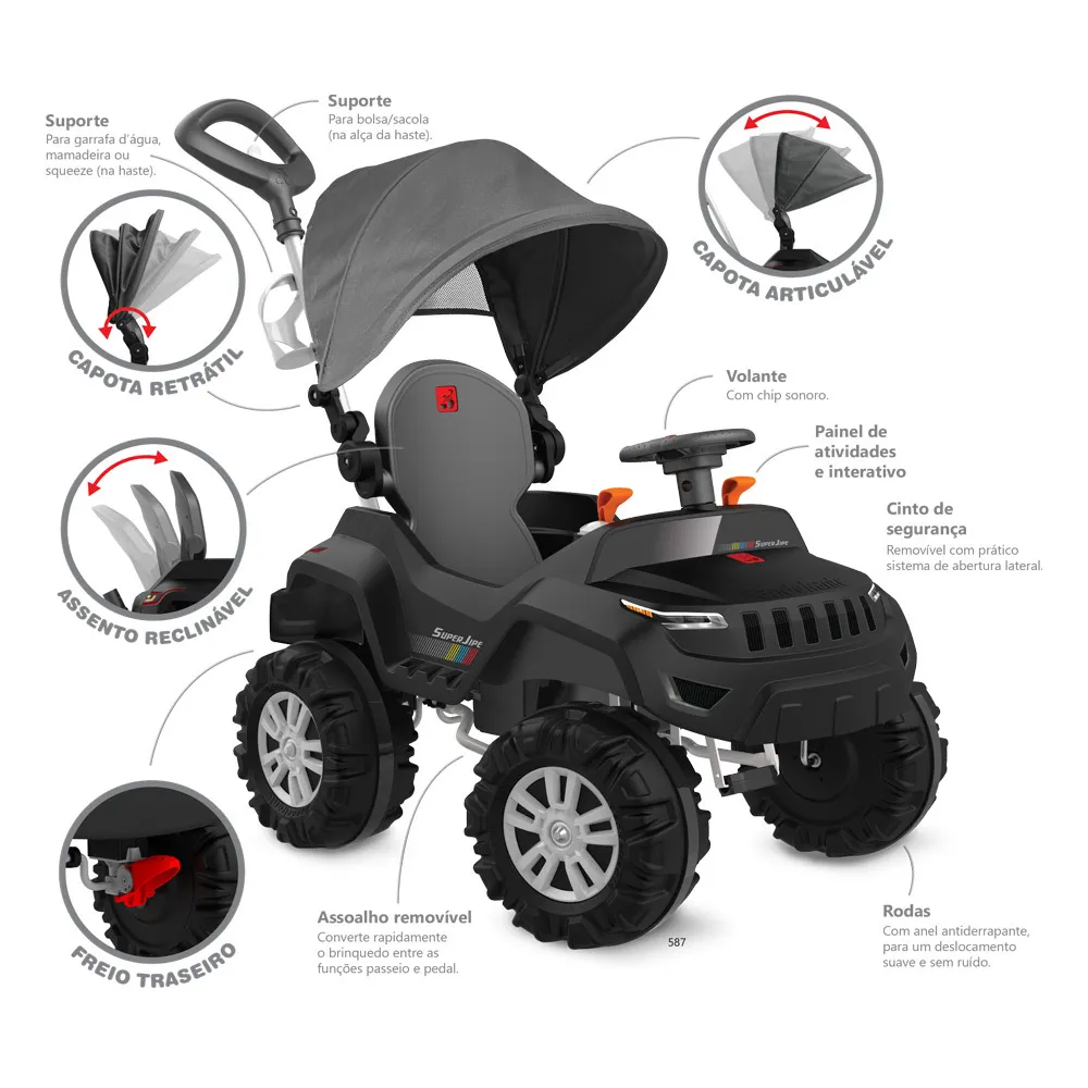 Um produto com duas funções, prático e moderno para o adulto e divertido para as crianças! FUNÇÃO PASSEIO: O adulto conduz o Superjipe Passeio e pedal como um carro de passeio. FUNÇÃO PEDAL: Permite à criança brincar livremente como um carro a pedal, bastando retirar o assoalho e a haste removível. Assoalho removível converte rapidamente o brinquedo entre as funções passeio e pedal. Haste articulável e removível. Capota articulável, retrátil e removível. Cinto de segurança Painel de atividades e volante com chip sonoro Assento reclinável em 3 posições Freio de segurança suporte para bolsa/sacola ( na alça da haste ) suporte para garrafa d’água, mamadeira ou squeeze (na haste ) Cinto de segurança removível com prático sistema de abertura lateral. Rodas com anel antiderrapante, para um deslocamento suave e sem ruído. Painel interativo. Idade: +12 meses. Peso máximo suportado: 35kg